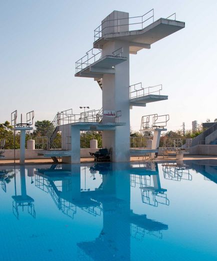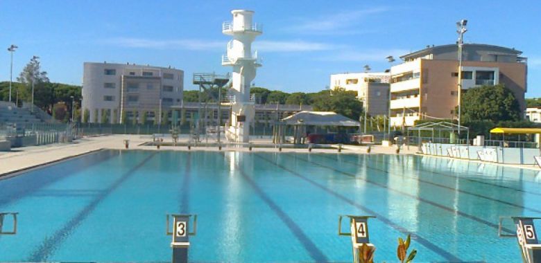 室外游泳池:一个50x25米、10泳道的游泳池、一个24x18米、水深5米的跳水池、一个配备5米、7米或10米跳台的跳水塔,以及另一个34x25米、10泳道的游泳池。