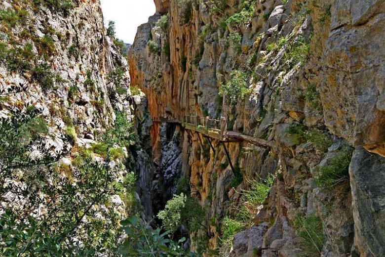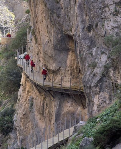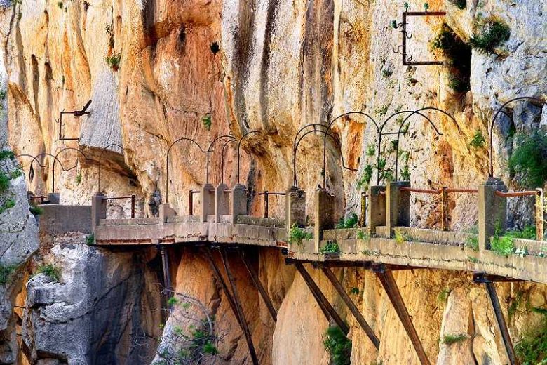 El Caminito del Rey (The Kings Path) is an air path built into the walls of Los Gaitanes gorge in El Chorro with a length of 3 kilometers long and a width of 1 meter. It begins in the town of Ardales, goes through Antequera, and ends in El Chorro (Alora). This path is hanging on the vertical walls of the gorge at an average distance of 100 meters above the river. It's one of the most famous hiking courses in Malaga.