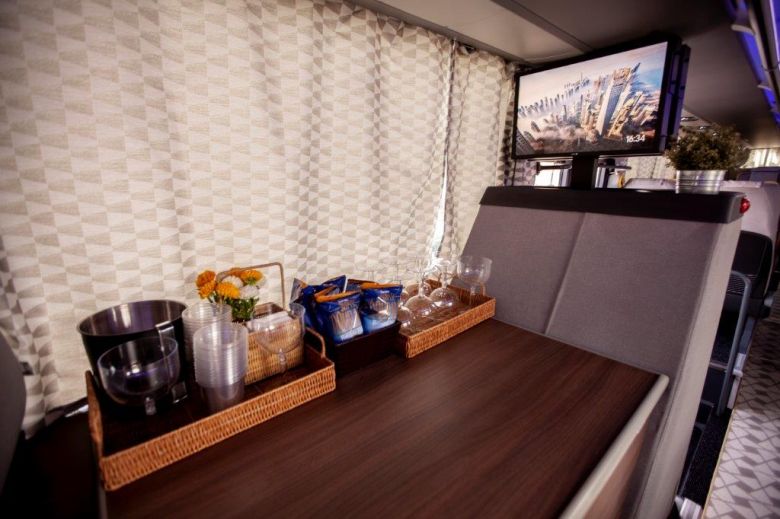 A configuração interna de 45 assentos, principalmente Club Seat com mesa, oferece uma maior interação entre os passageiros para trabalhar, comer ou simplesmente relaxar durante a viagem. A decoração é única e traz uma exclusividade para a tua viagem.